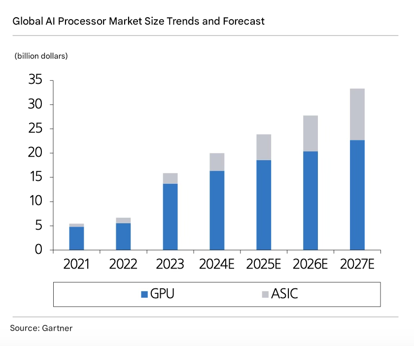 Gartner projects the AI custom semiconductor market to grow at a compound annual growth rate (CAGR) of 49% from 2023 to 2027, reaching $10.6 billion by 2027. While the absolute market size remains smaller than the GPU market (currently at $13.7 billion), the growth potential of custom semiconductors is greater in terms of growth rate, as GPUs are expected to grow at a CAGR of 13% over the same period.