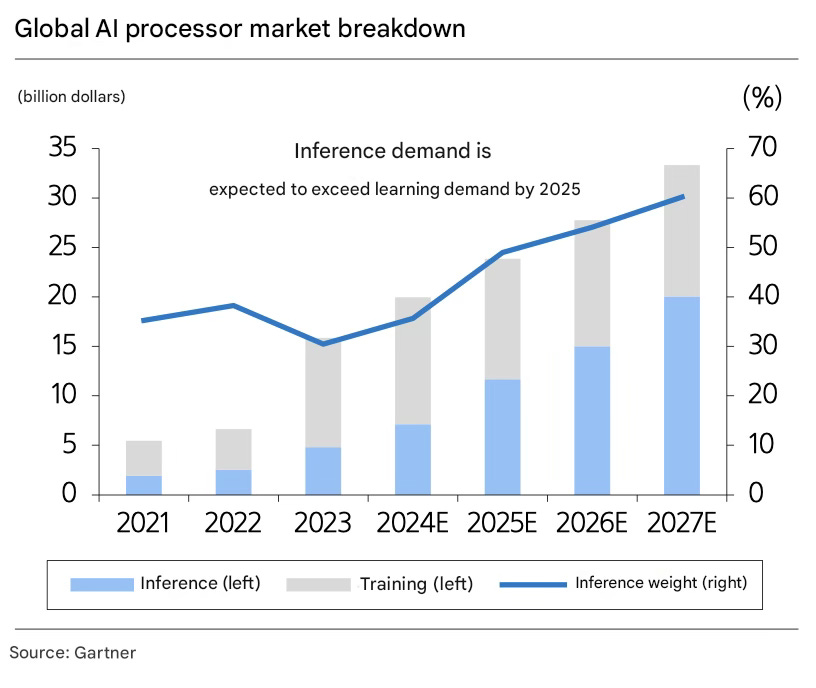 Gartner estimates that by 2025, the demand for inference will surpass that of training. By 2027, inference is projected to account for 60% of total AI semiconductor demand. From 2023 to 2027, the compound annual growth rates (CAGR) for training and inference semiconductors are estimated at 5% and 43%, respectively. While the training market will continue to grow, the inference market is expected to expand 1.5 times faster.