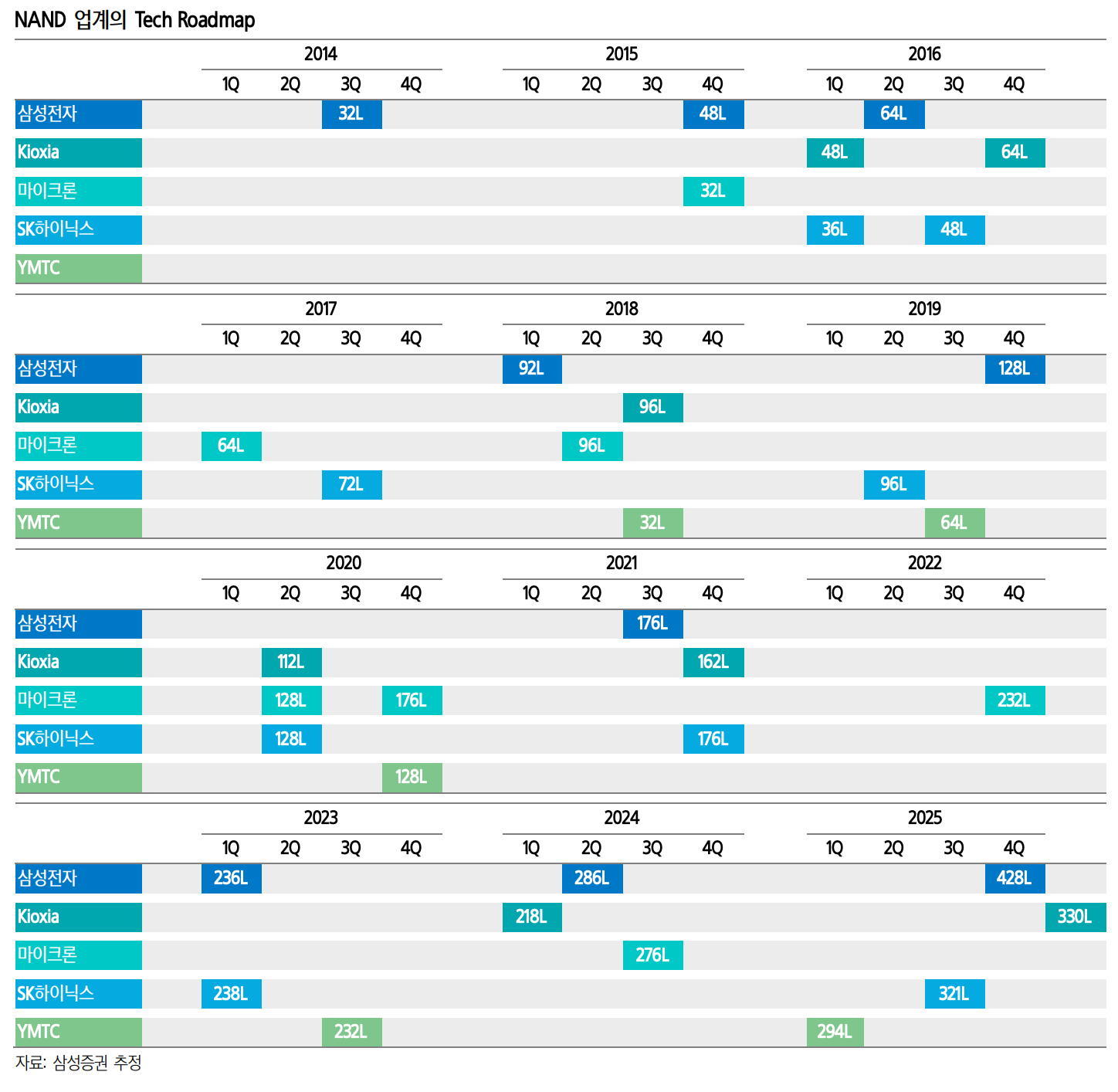 • Typically, the Peri occupies about 20–30% of the total area; placing it under the Cell enhances design efficiency. Leveraging these technical advantages, SK Hynix has applied this structure from 96 layers onward, while Samsung, Micron, and Kioxia have done so from 176 layers onward.