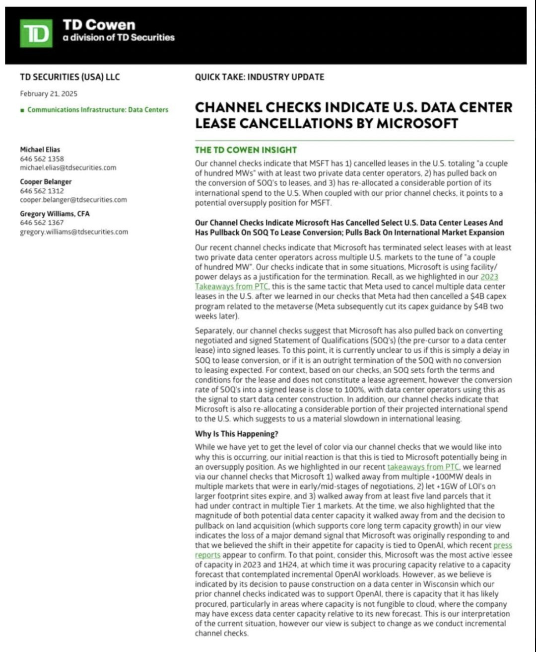 Then, on the very next day—the 21st—TD Cowen released a report stating that “Microsoft is reducing its investment in data centers.” Investors quickly drew their conclusions: