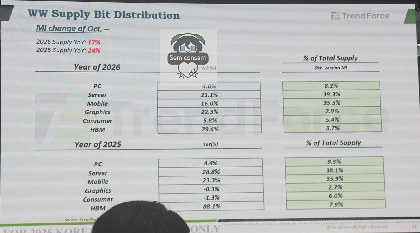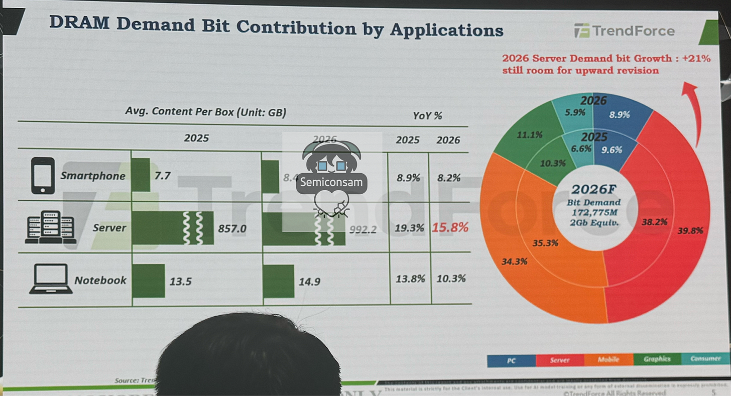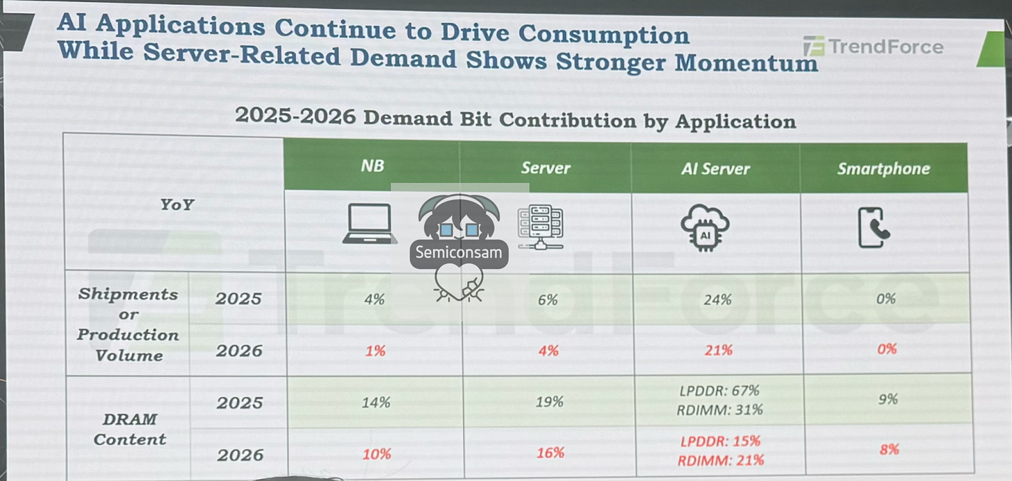 The growth of the DRAM market in 2026 is essentially driven by AI servers and general-purpose servers. In particular, the recovery in general-purpose servers is expected to make a meaningful contribution to DRAM demand. Also, while PC shipments are relatively modest, the notable increase in DRAM content per device deserves attention (driven by AI PCs).