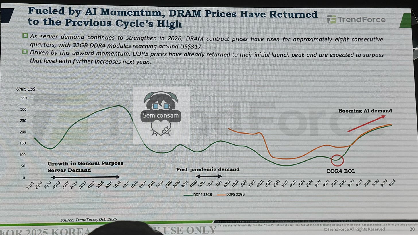 Manufacturers are halting DDR4 production to allocate their limited DRAM production lines to HBM and DDR5. As a result, despite being an EOL product, supply to support legacy server demand disappears, creating the bizarre situation where even “older products” are experiencing price spikes.