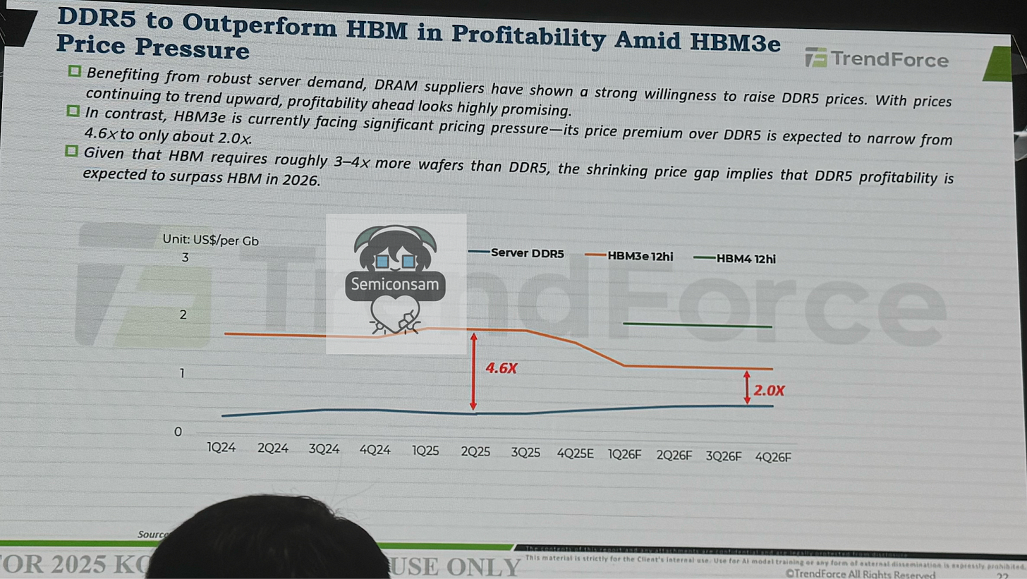 Result: The price gap between HBM3e and DDR5 narrows sharply from 4.6x in 2Q25 to 2.0x in 4Q26.